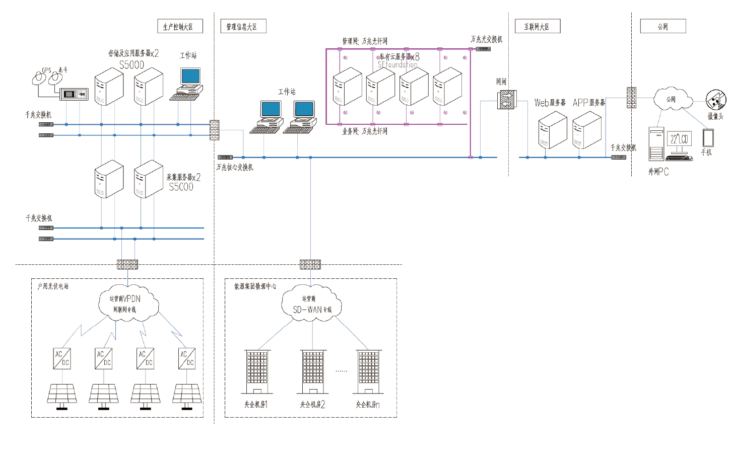 架构安全可靠采用私有云部署,内外网分区,逆变器采集棒数据采用APN加密通道直传云平台,所有数据不暴露公网